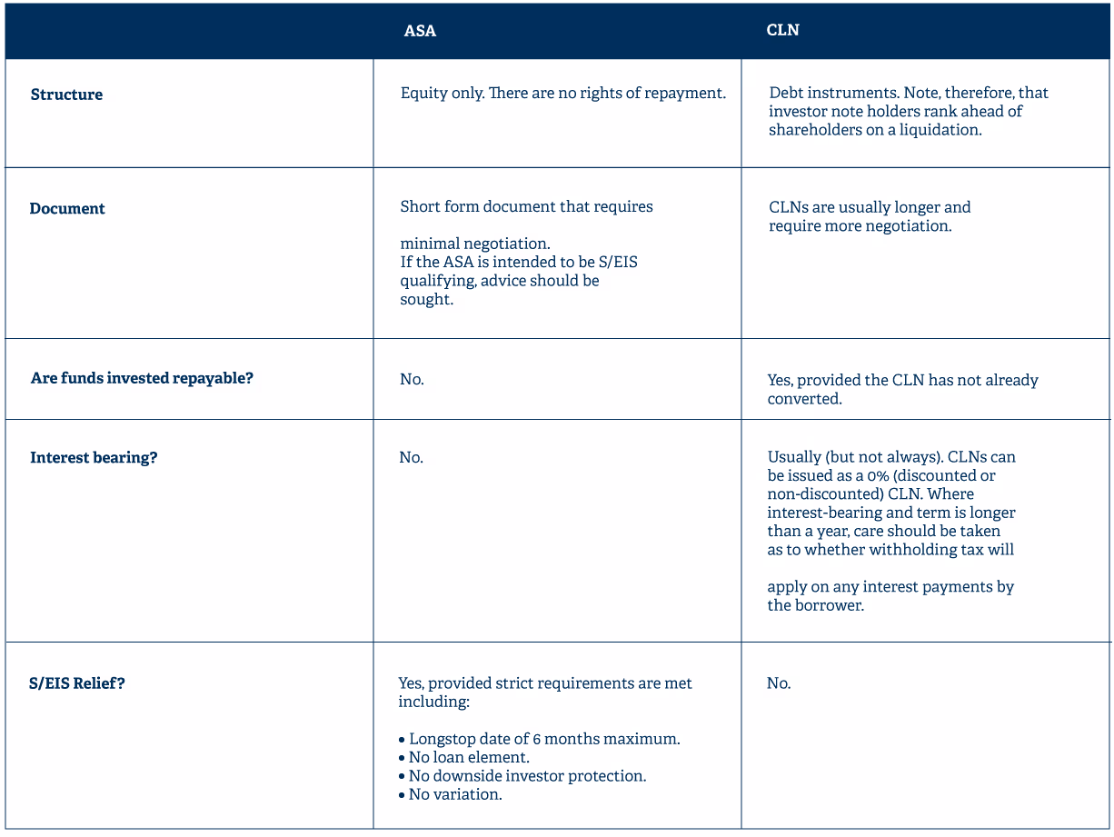 Before we dive into the detail on ASAs and CLNs, it’s worth noting that investors may also come across SAFE (‘simple agreement for future equity’) and KISS (‘keep it simple security’) agreements. The SAFE was created in the US by the Y Combinator in 2013 and, although not the same, it is often referred to as the US version of an ASA and is considered a founder-friendly form of financing. KISS convertible notes were created by 500 Startups as an alternative to the SAFE, and unlike the SAFE, include investor protections. Both the SAFE and KISS have been developed for use in the US market (incorporating US legal terms), and we would advise exercising caution when using in respect of an investment in a UK company.